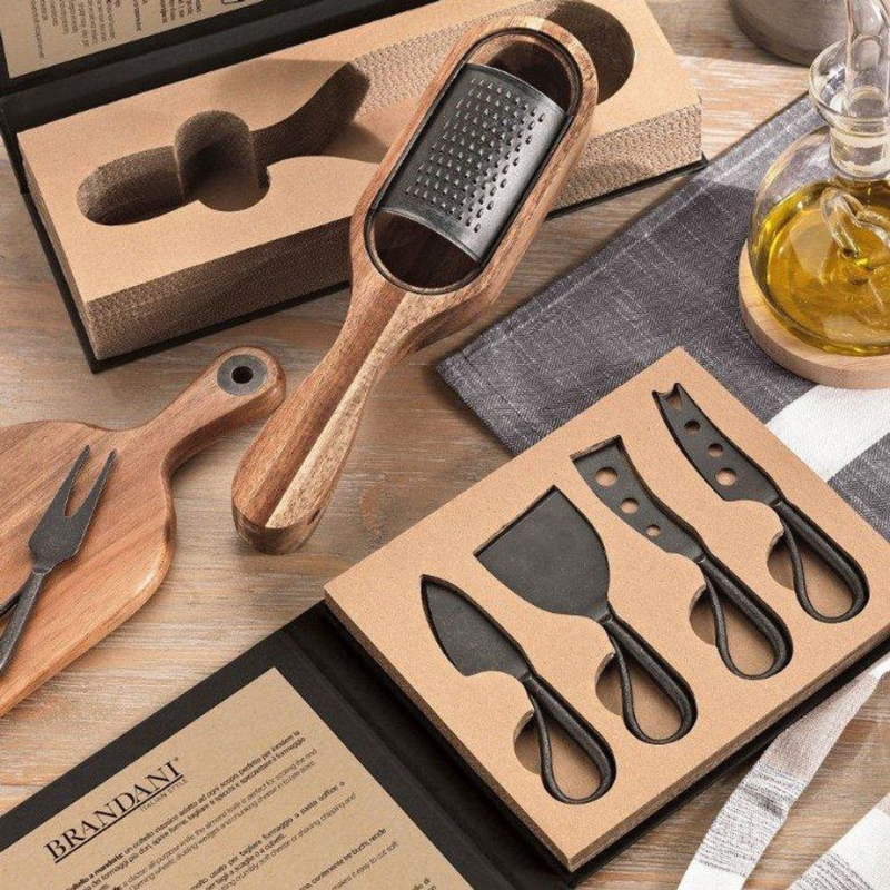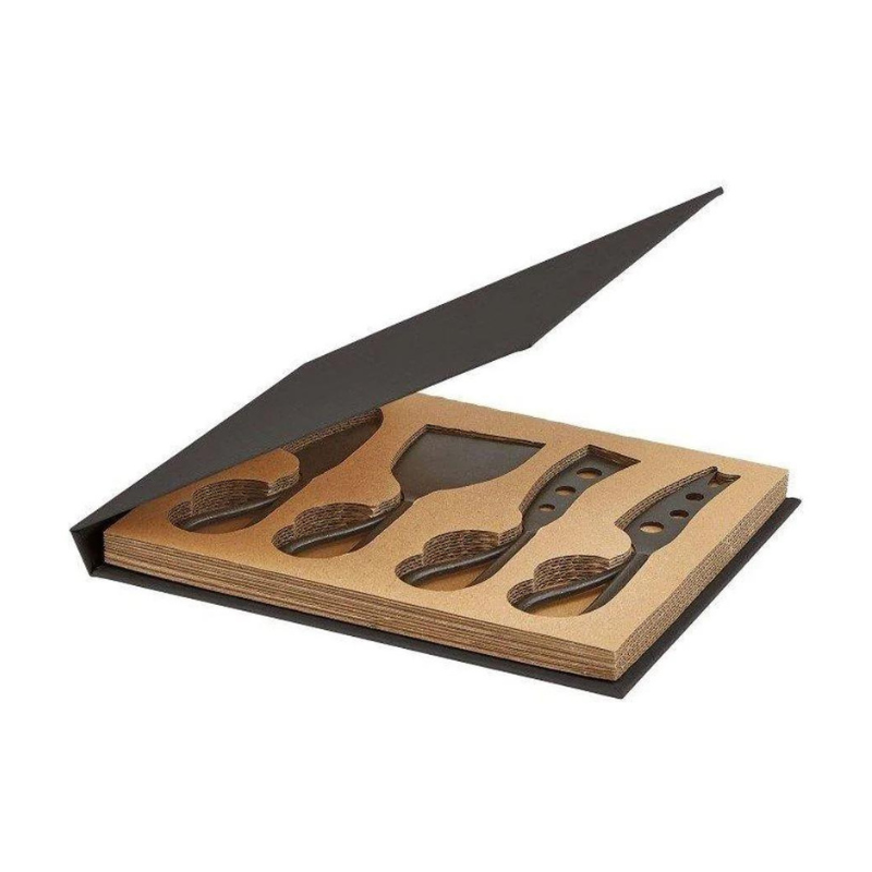 O conjunto é composto por 4 facas de queijo diferentes com aspeto cru industrial e design único, que certamente assumirão o papel de protagonista na mesa. O conjunto é composto por uma faca de ponta pontiaguda para ralar queijos duros, uma faca de superfície plana adequada para queijos frescos e queijos de pasta mole curados com mofo azul, uma faca para cortar queijos semiduros e uma faca para cortar queijos de pasta mole com furos na lâmina e ponta bifurcada. O aço inoxidável de alta qualidade é extremamente resistente à ferrugem e aos sinais de desgaste e, ao mesmo tempo, garante a maior precisão possível no corte. Combinado com uma embalagem atraente, o conjunto é mais do que um grande presente. Recomenda-se lavar as facas à mão.
