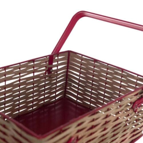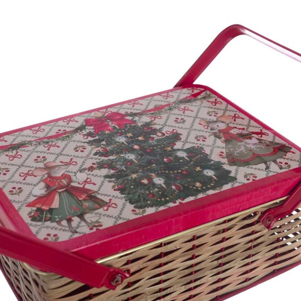 Cesta de Natal em rattan trançado com tampa de lata esmaltada decorada com laços vermelhos e motivos natalícios . Perfeita como recipiente ou como ideia de presente. Também pode ser usada como centro de mesa, criando arranjos com galhos, pinhas ou velas.