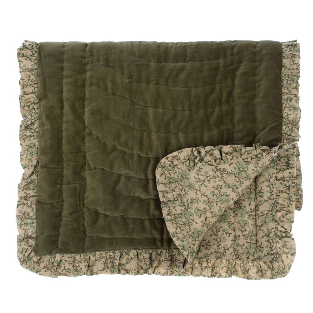 O Conjunto de tapa pés + 2 Almofadas dupla face Petali Velluto da Blanc MariClò é o toque final perfeito para um quarto sofisticado. Um lado apresenta o aconchego do veludo verde-oliva, enquanto o outro oferece a delicadeza do algodão com uma estampa floral verde-sálvia sobre uma base cru. A construção acolchoada garante maciez e conforto, enquanto as bordas com babados adicionam charme e volume.