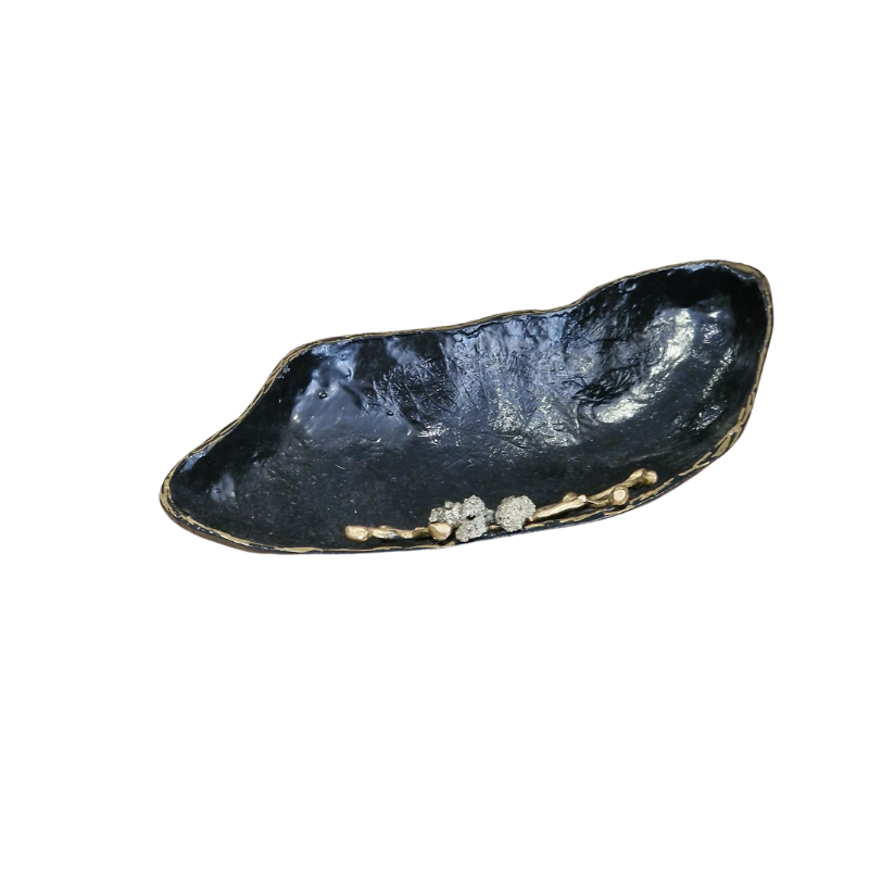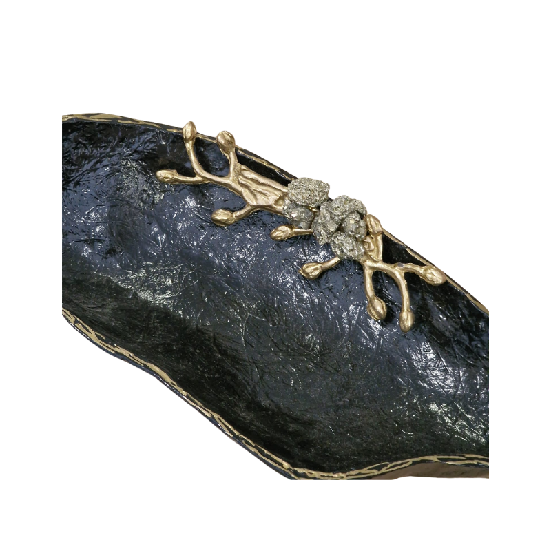 Esta peça une a natureza à arte, criando um objeto único e sofisticado, pintada à mão com detalhes em latão dourado e adornada com a pedra natural pirite, é a combinação perfeita entre a beleza natural e a criatividade humana.